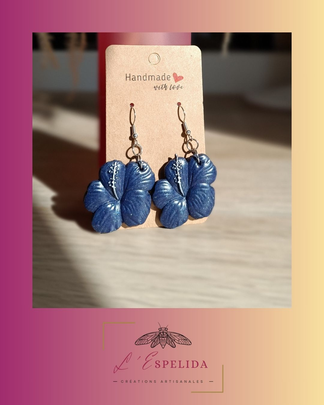 Boucles d'oreilles en argile polymère, en forme d'hibiscus bleu pailleté.