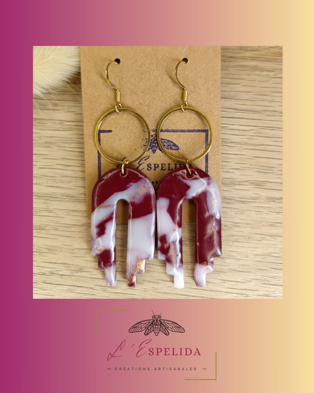 Boucles d'oreilles ultralégères en argile polymère marbrées bordeaux et blanc.