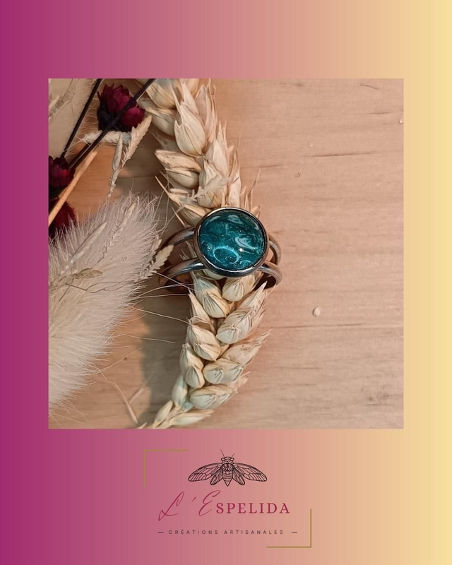 Bague argentée, cabochon bleu/vert et argenté